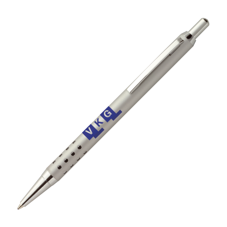 LIPARI alu balpen Peekay. Karaktervolle aluminium design balpen met glansverschroomde metalen clip, drukker en puntstuk. Houder voorzien van opvallend stansmotief met zilverkleurige achtergrond. Voorzien van blauwschrijvende plastic langschrijfvulling voor vele meters schrijfplezier