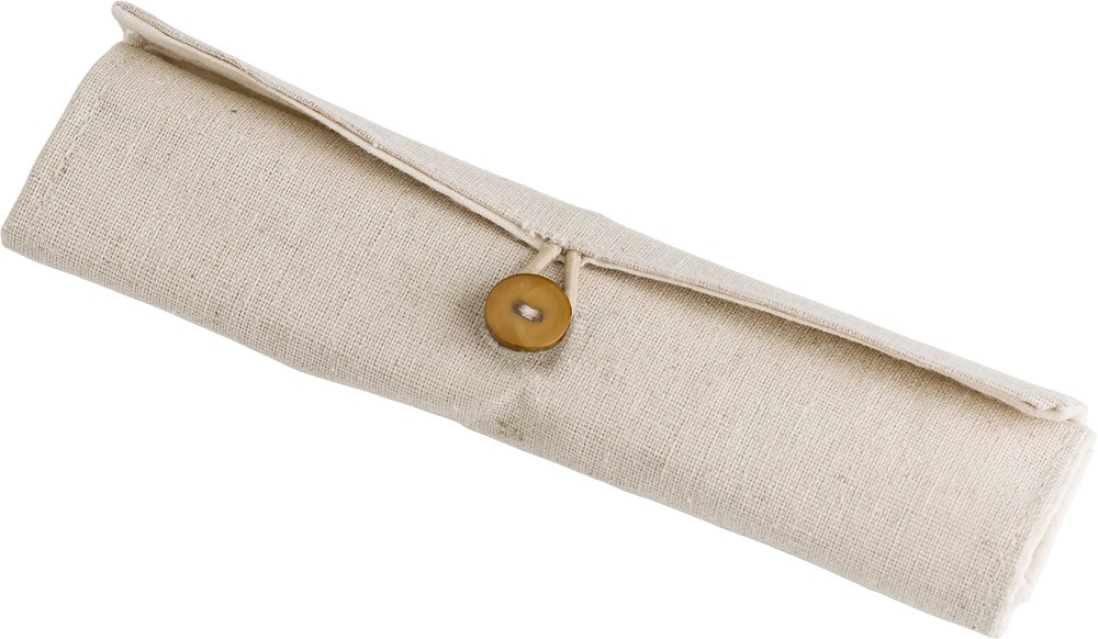 Katoenen oprolbare hoes met schrijf set, inclusief: bamboe liniaal, houten puntenslijper, gum,...meer
