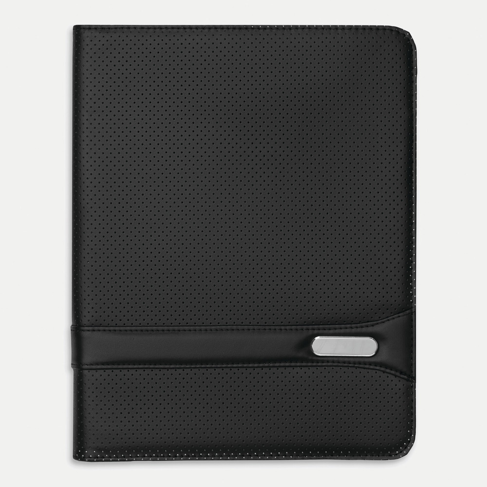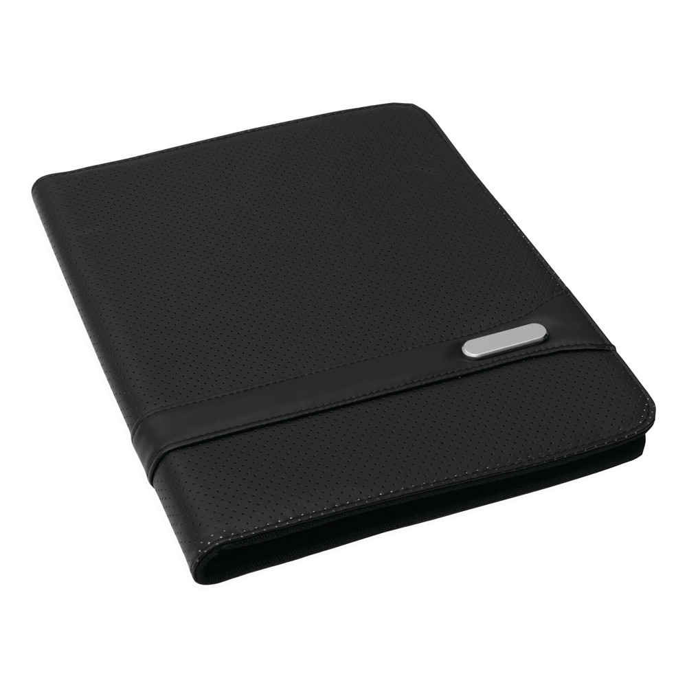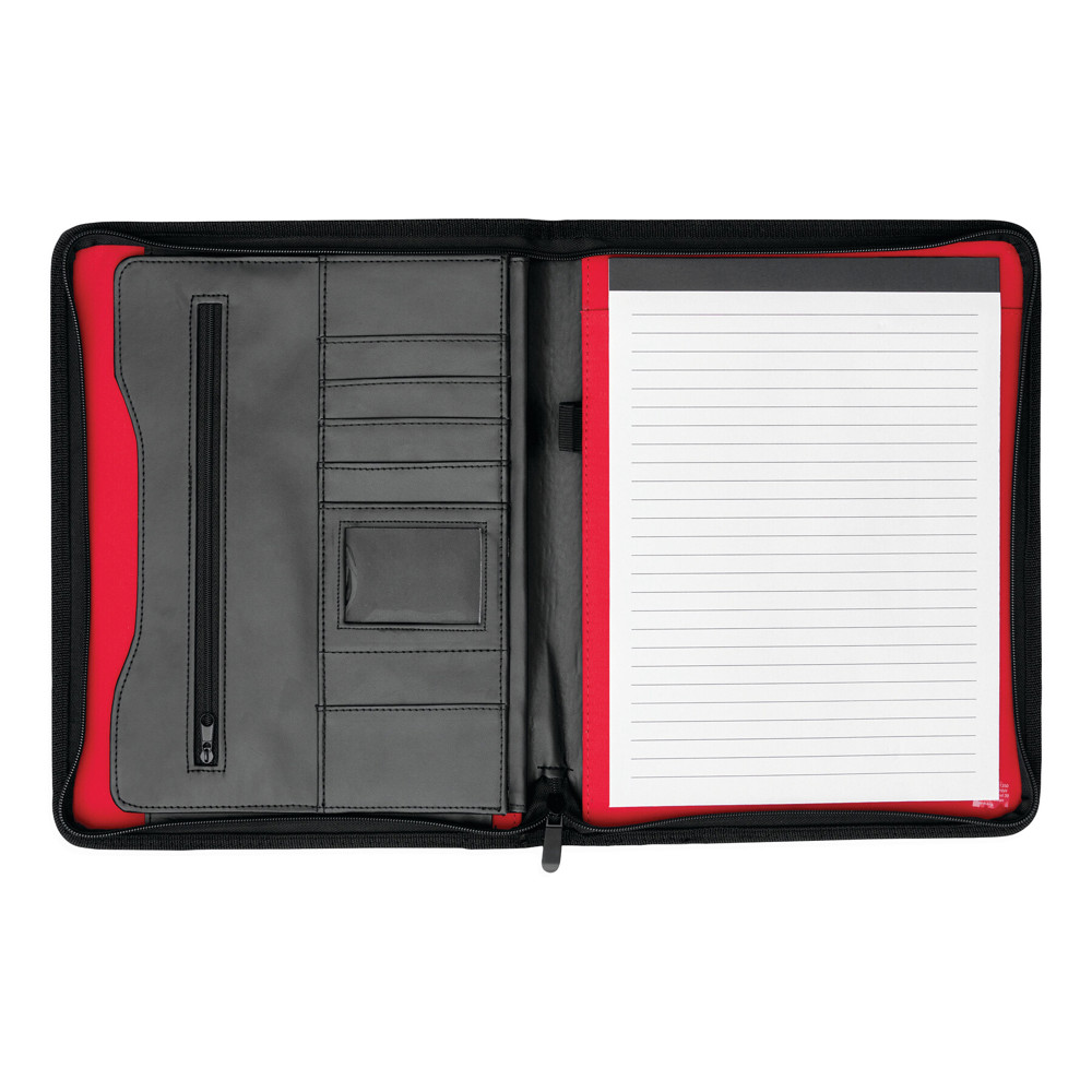 Kunstlederen A4-portfolio MANHATTAN met ritssluiting, schrijfblok, diverse insteekvakken waarvan 1 met zichtvenster, een dmv rits afsluitbaar vak en penhouder. Metalen plaatje voor lasergravure of bedrukking.