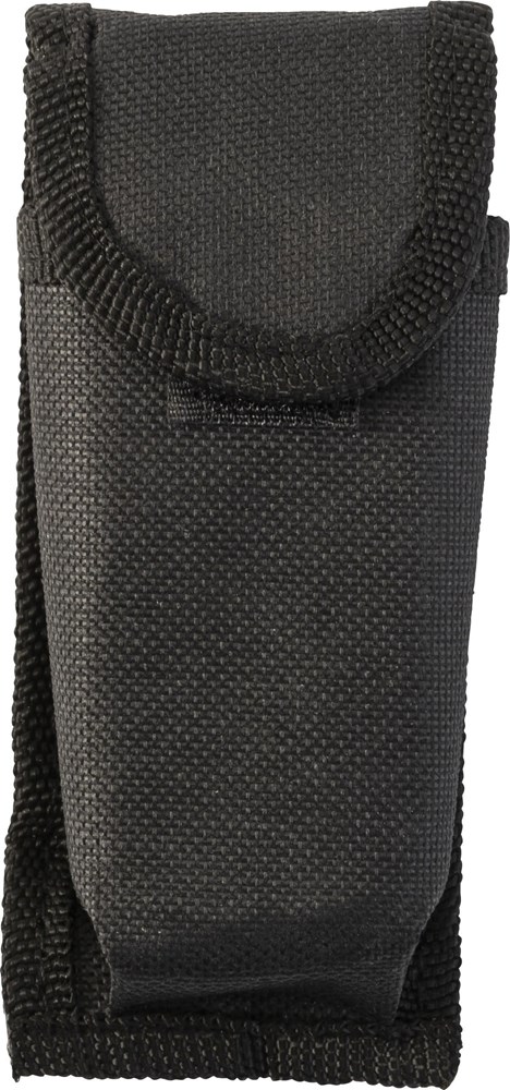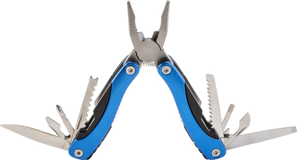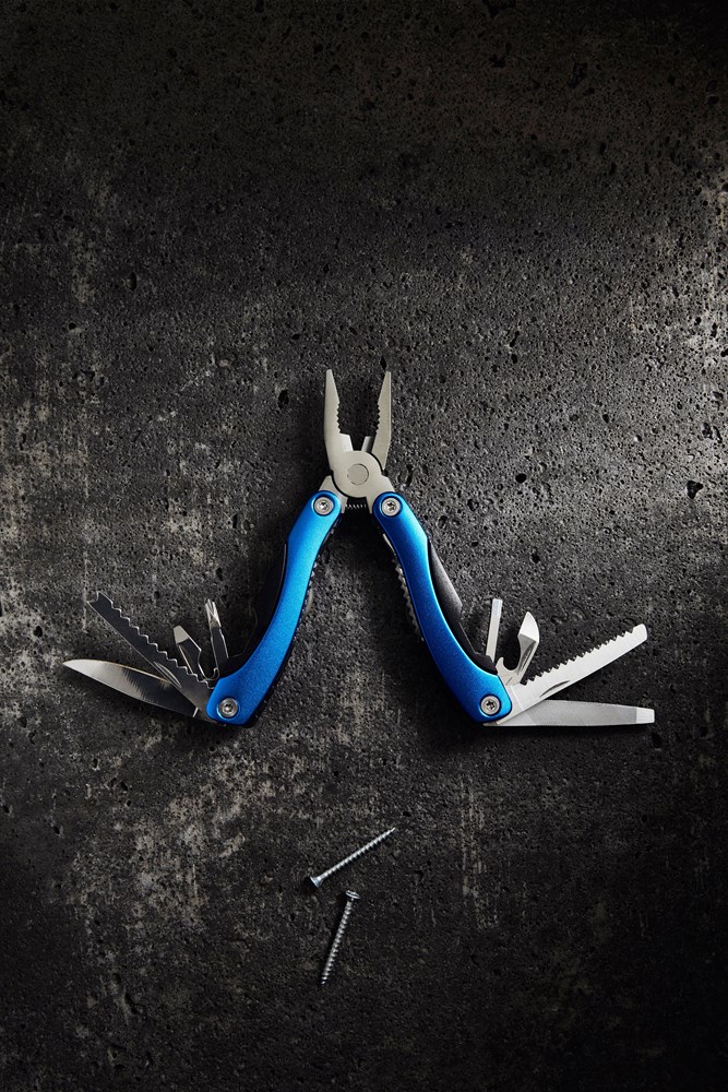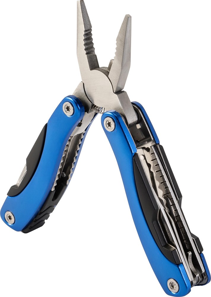 Metaal, multifunctioneel gereedschapset met ABS accenten. De tool bestaat uit: een tang, een zaag, een mes, twee schroevendraaiers (platte kop en kruiskop), een vijl, een flessenopener, een visschraper, een notenkraker en een liniaal met inches. In hoes.