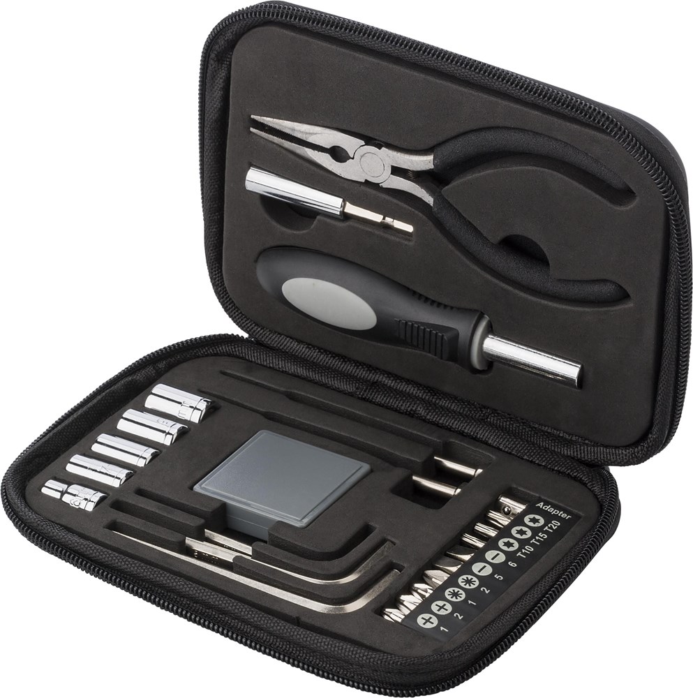 PU lederen etui met gereedschapsset, sluit met ritssluiting. De set bevat: 5 doppen, 3 zeskantschroevendraaiers, 9 schroefbits, 1 dopsleutel, 1 meetlint, 2 precisieschroevendraaiers, 1 schroevendraaierhandvat, 1 verlengstuk, 1 tang.