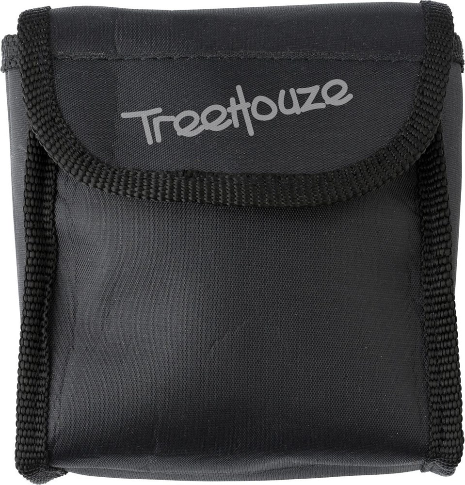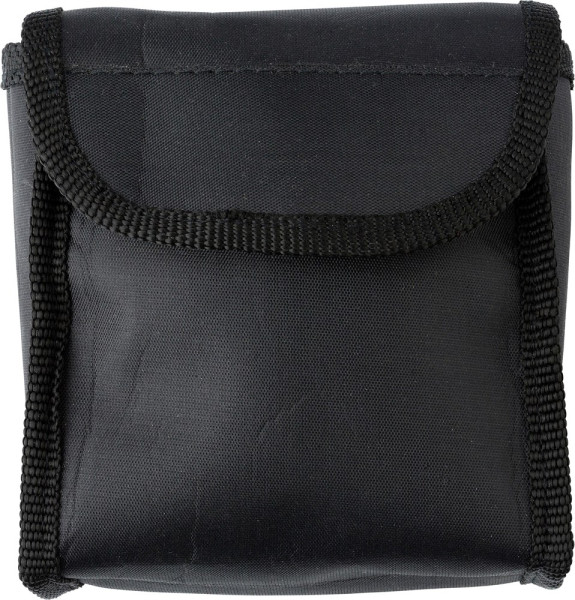 Kunststof verrekijker (4 x 30) met rubberen elementen, verpakt in nylon etui met riemlus en incl. schoonmaakdoekje.