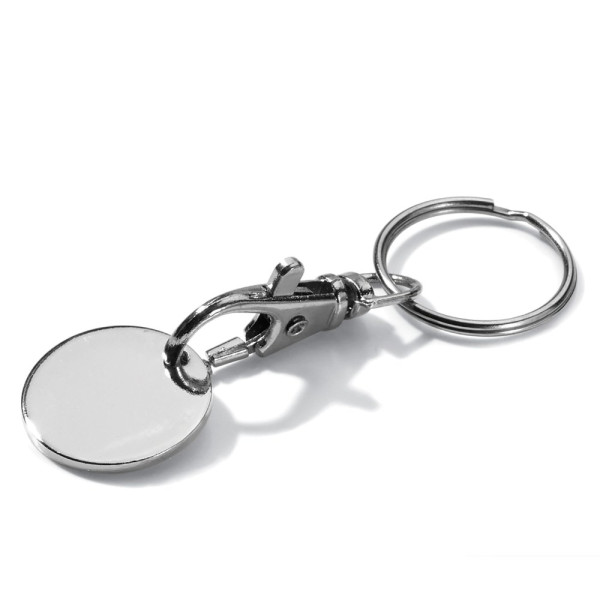 Metalen winkelwagenmuntje met karabijnhaak en sleutelhanger ring. Eenvoudig aan de sleutelbos te...meer