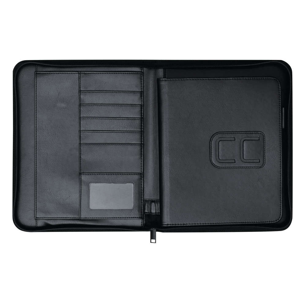 Luxe, dmv een rits afsluitbare, portfolio NEW AGE met uitneembare i-Pad/ tablet hoes (ca. 24 x 17,7 cm.). Ruimte voor 5 visitekaartjes; een schrijfblok; 1 transparant vak; 1 groot insteekvak en 1 penhouder.