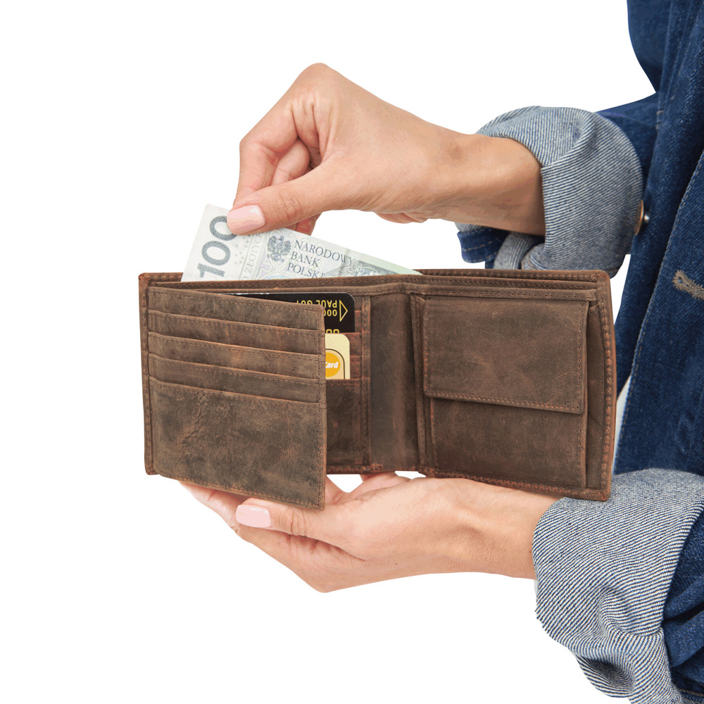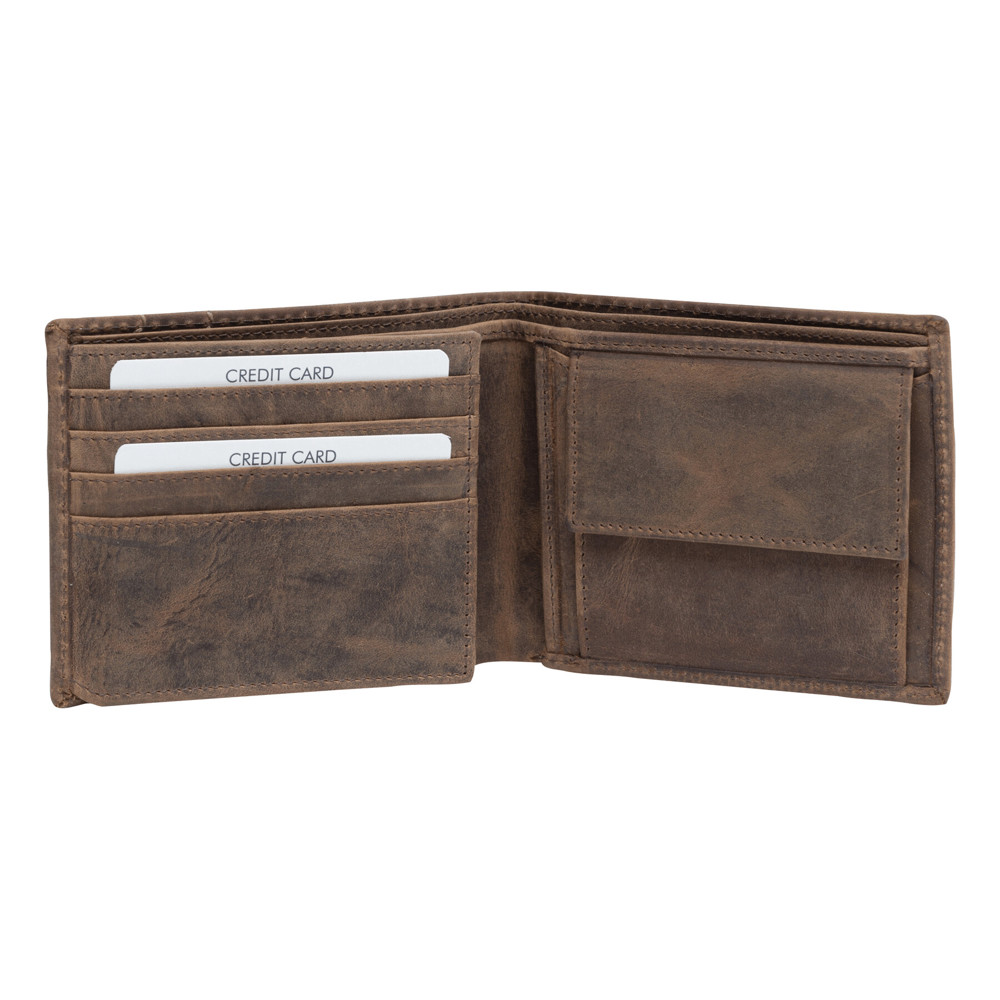 Lederen billfold portemonnee WILDERNESS I: 8 creditcardvakken, 2 bankbiljetvakken, 1 muntvak met drukknoopsluiting, 1 mesh vak voor ID-kaart of rijbewijs, 2 extra vakken.