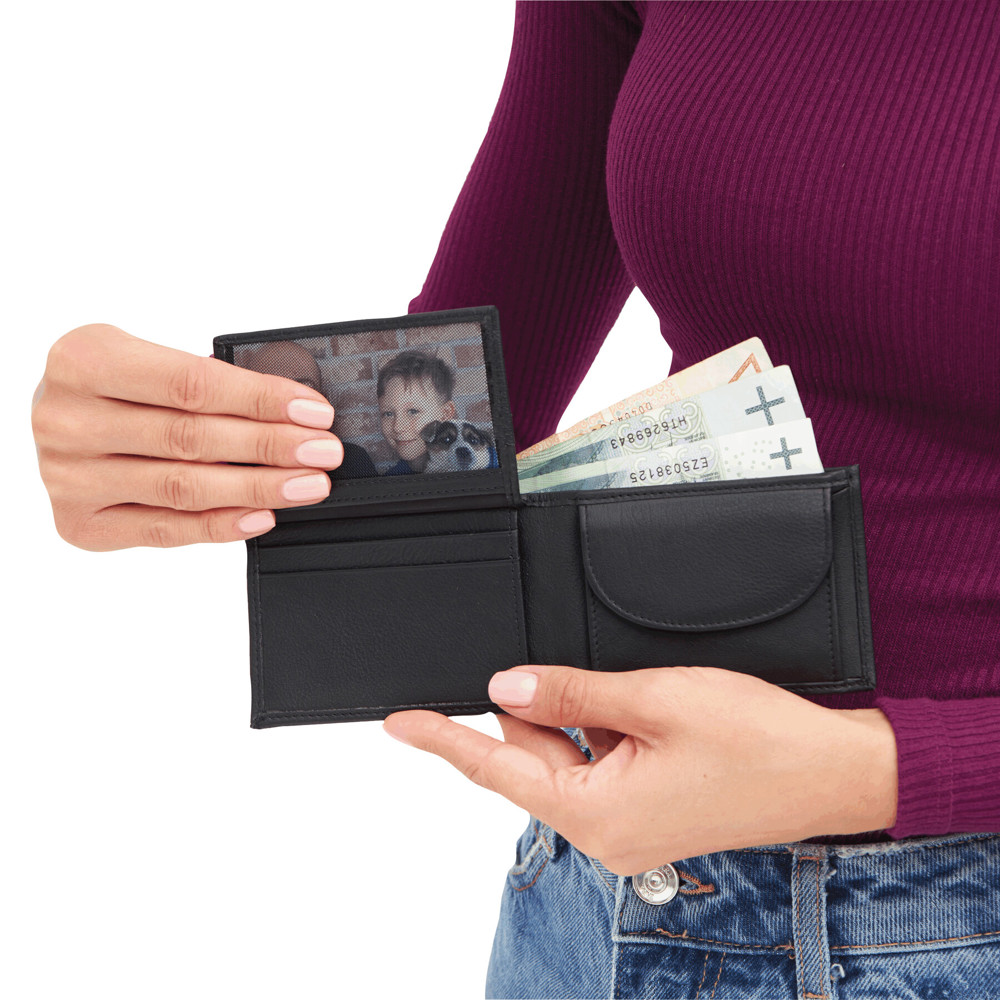 Lederen portemonnee HOLIDAY; 4 insteekvakken voor pasjes, 2 vakken voor bankbiljetten, een muntvak met drukknopsluiting, een netvak voor bijv ID-kaart of rijbewijs en aan de buitenzijde nog een extra insteekvak.
