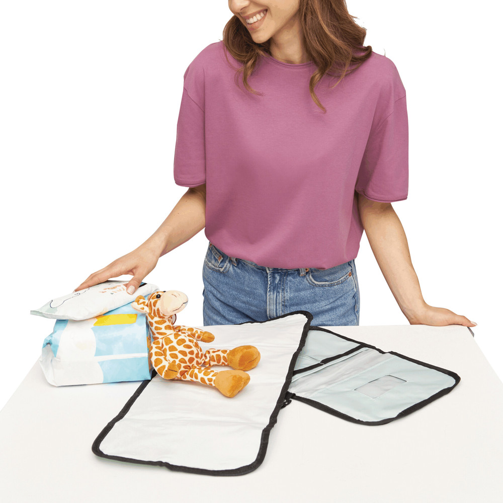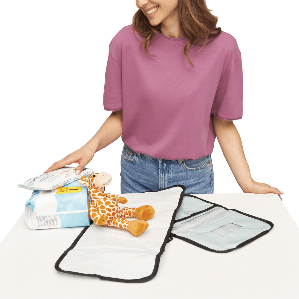 Baby Luiertas BABY FIRST met waterafstotende en licht gewatteerde ligmat, met functioneel vak voor vochtige doekjes met praktische opening. Tas is voorzien van verschillende insteekvakken voor luiers etc, 2 ritsvakken voor kleine attributen, draag en bevestigingslus met drukknop om b.v. een fopspeen aan te bevestigen, of ter bevestiging aan de kinderwagen. Met elastische sluitband, die het mogelijk maakt met 1 hand de tas te openen. Het is een praktische kleine luiertas te gebruiken als handtas of in de auto, geschikt voor kleine uitstapjes.