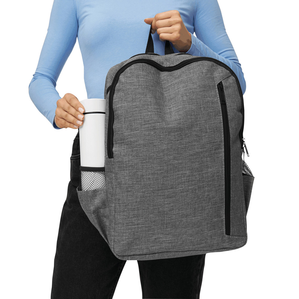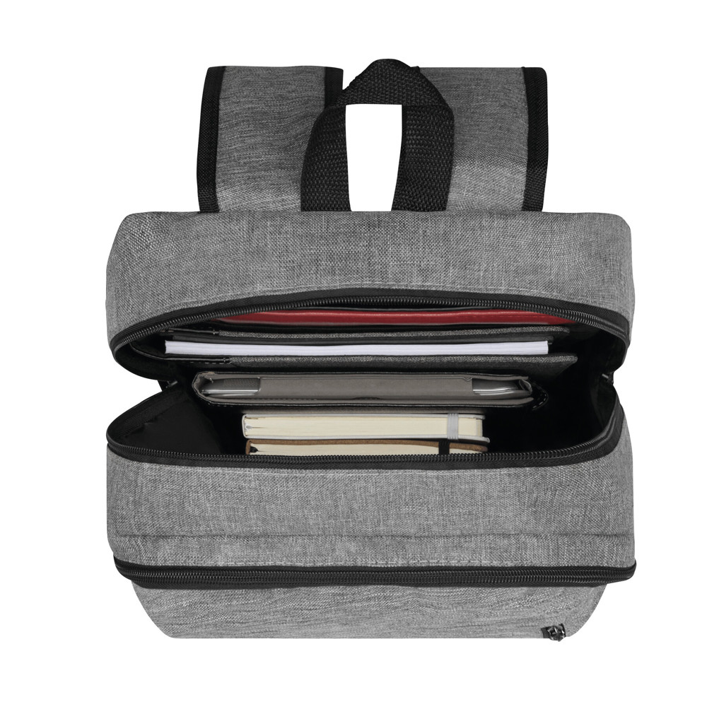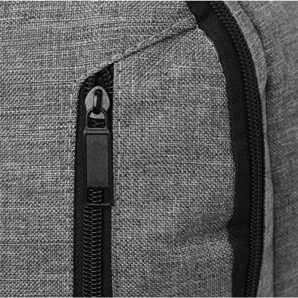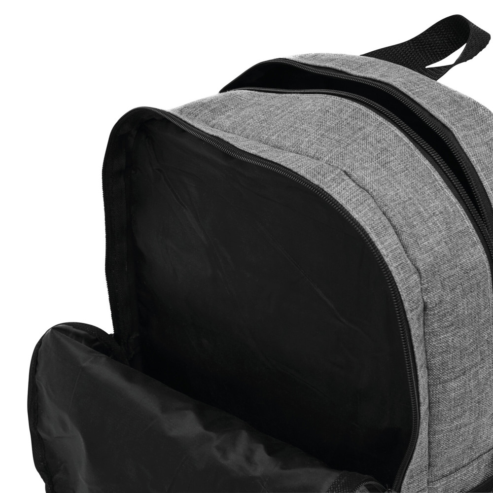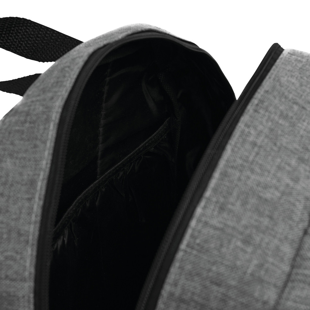 Rugtas DONEGAL S; voorvak met verticale rits; groot voorvak met rits en groot hoofdvak met rits en gefoamd laptopvak binnenin. Buitenkant met handvat bovenop en achterkant met gefoamde schouderbanden en rug.