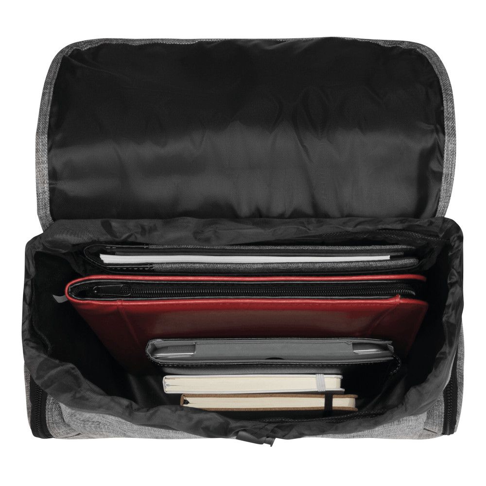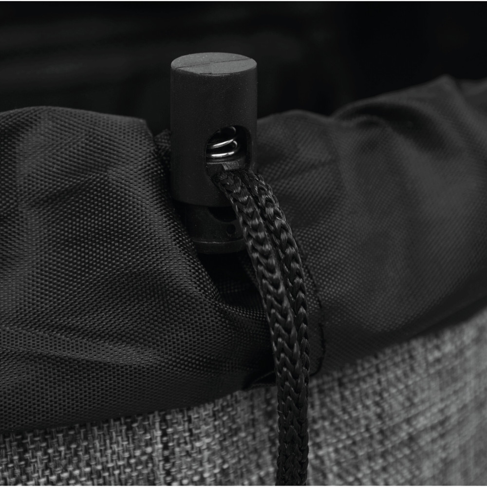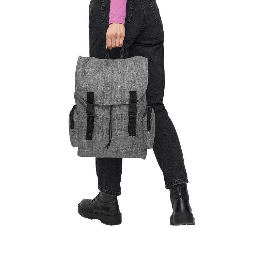 Rugtas DONEGAL S; hoofdvak met koordsluiting, 2 sluitbuckles en binnenin met gevoerd laptopvak. Aan de buitenkant aan beide zijkanten een ritsvak; bovenop een handvat en achterkant met gefoamde schouderbanden en rug.