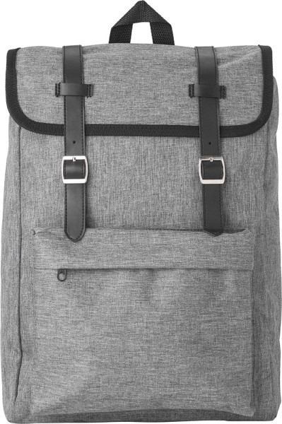 Polyester (300D + 210D) rugzak met voorvak. De flap sluit met twee metalen gespen. De rug en schouderbanden zijn gewatteerd en de schouderbanden zijn verstelbaar.