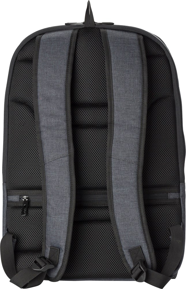 PVC rugtas met twee compartimenten, één geschikt voor een laptop (15 inch). De rugtas heeft een antidiefstal vak aan de achterzijde en aan de voorkant twee ritsvakken. De verstelbare schouderbanden zijn gewatteerd.