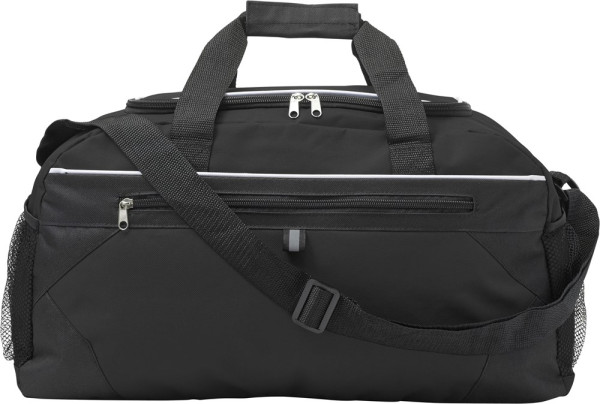 Polyester (600D) sporttas/reistas, met aan de voorzijde een extra insteekvak met rits en steekvakken in beide zijkanten en verstelbare draagriem.