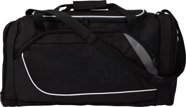 Polyester (600D) sporttas/reistas met groot ritsvak, een zijvak en een speciaal compartiment voor schoenen. Alle ritsen zijn zwart. Met verstelbare schouderband.