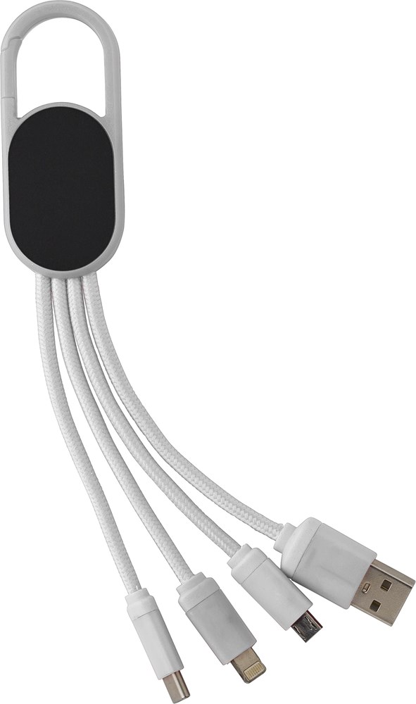 4 in-1 Laadkabel set met haak. De set heeft een USB, USB-C, micro USB en Lightning plug. Na laser graveren licht het logo op wanneer de kabel in gebruik is.