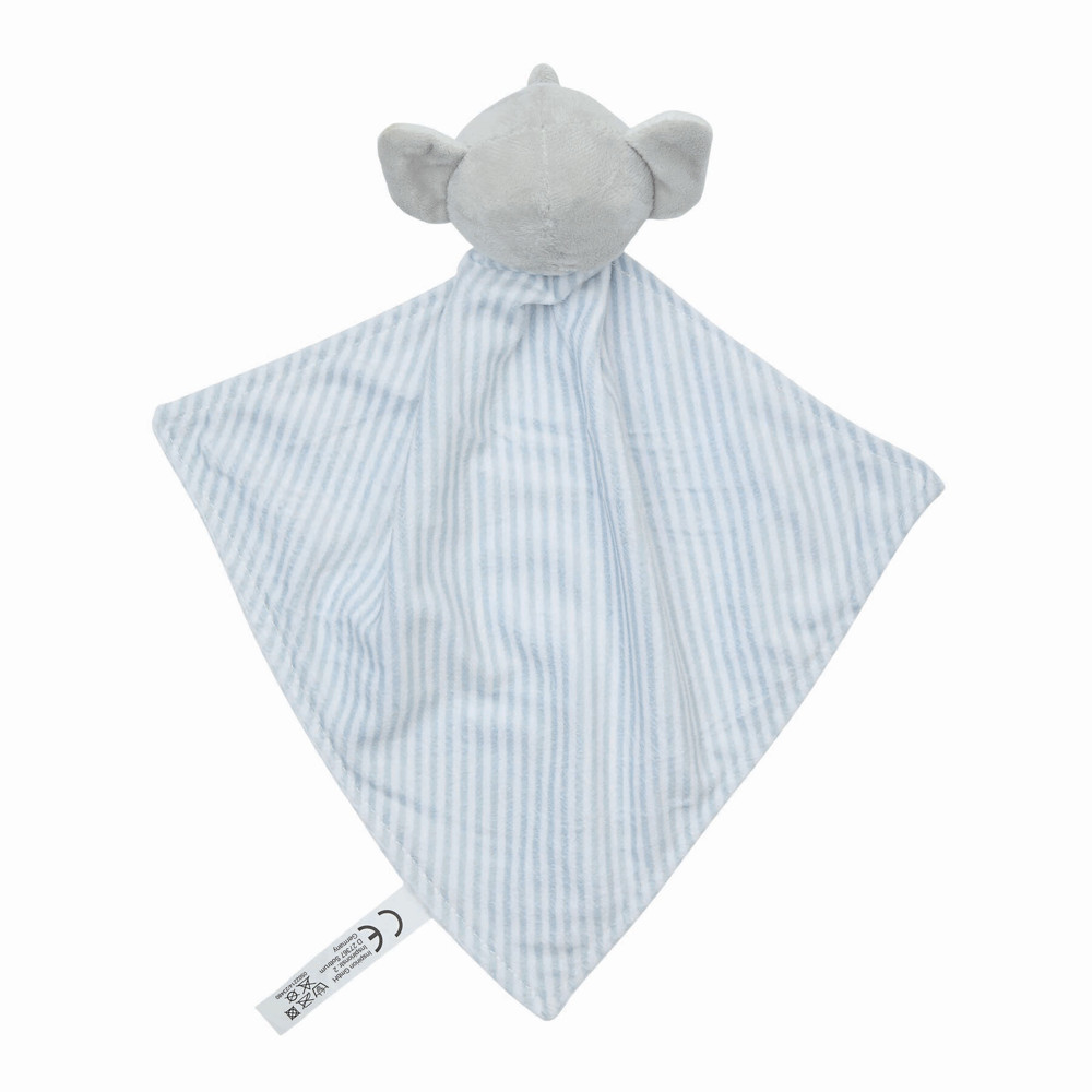 Knuffelolifant DOMI: zachte stof, zonder bedrukking geschikt voor kinderen onder 3 jaar, met aangehecht kaartje voor bedrukking.