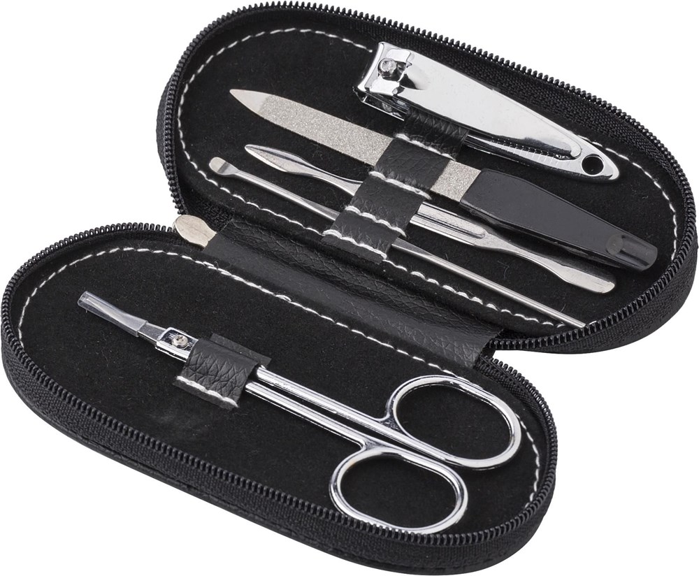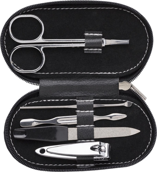 PVC hoesje met manicure set, inclusief: schaar, nagelvijl, nagelschaar, nagelriem bokkenpootje en nagelriem instrument.